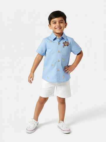 Boys Blue-White Embroidered Half Sleeves Collar-Neck Casual Shirt With Shorts