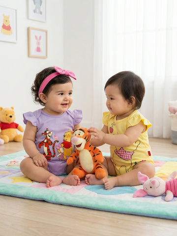 Delight your li’l princess with this cheerful pack of 2 bodysuits in yellow and lavender, featuring cute Disney Winnie the Pooh placement prints. The flutter cap sleeves add a charming touch, while the soft, skin friendly and sturdy 220 GSM interlock cotton ensures comfort during all her playful adventures. Finished with easy popper closure for fuss free dressing and nappy changes, these bodysuits are perfect for everyday wear and cute photo moments.