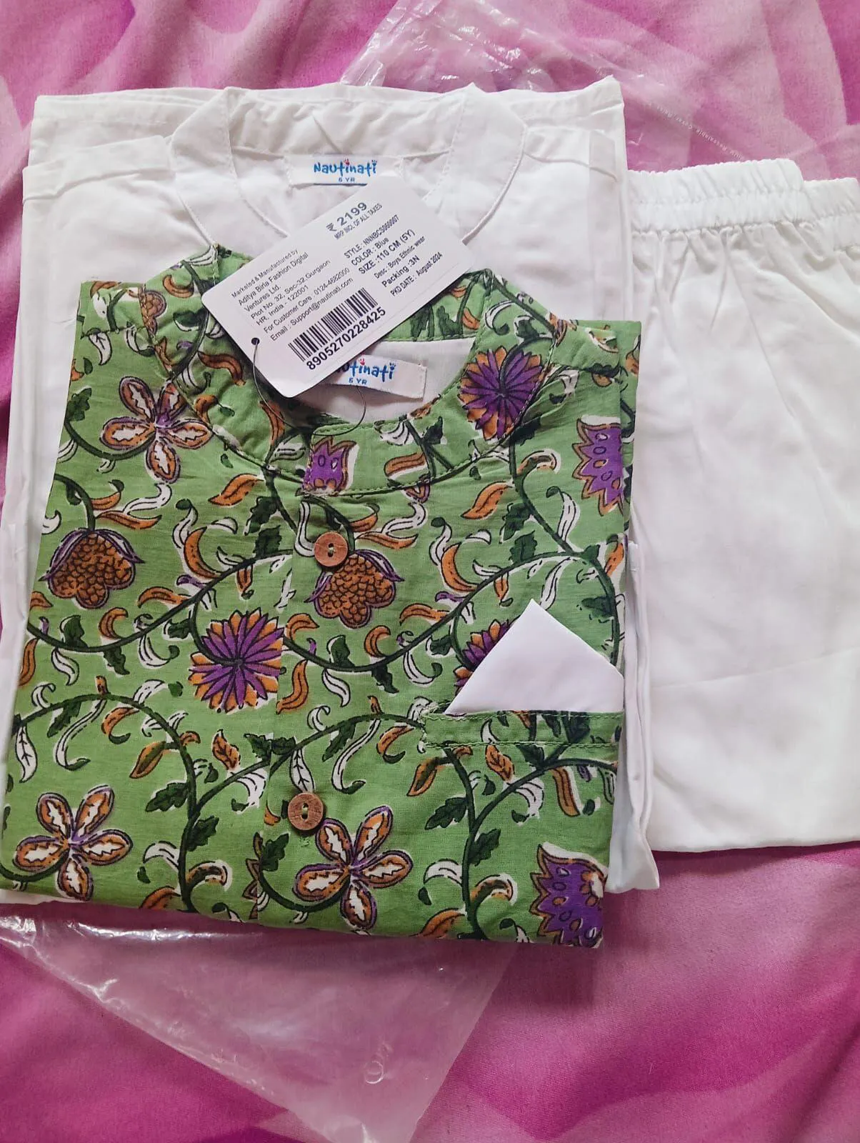 Dress your little one in this Nautinati ethnic cotton kurta set for boys for festive charm and all-day comfort. Crafted from a soft cotton blend, it keeps him cool and relaxed. The plain kurta and pants add a touch of tradition, while the matching block-printed waistcoat complete the look with elegance. A Mandarin collar and full sleeves give it a polished finish, making it perfect for festivals, weddings, and special occasions.