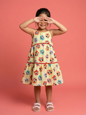 Nautinati Girls' 100% Cotton All-over Disney Minnie Mouse Floral Printed A-line Tiered Dress with Ladder Lace Design
