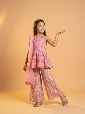 Let your li’l princess celebrate in style with this pink kurta set featuring a floral all-over printed shirring halter-neck kurti and striped palazzos. The stylish halter design adds a trendy touch, while the summer perfect cotton blend keeps her comfortable all day. Vibrant resort prints make it perfect for festive occasions, family gatherings, and picture-ready moments. Elastic closure ensures easy dressing and playful comfort.