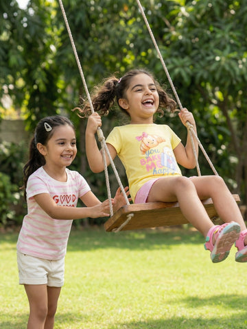 Brighten your li'l princess's everyday playtime with this pack of 2 cotton T-shirts from Nautinati. Designed with a classic crew neck finish, soft single jersey fabric, breathable and lightweight comfort, and fun graphic and striped prints, these tees keep her comfy and cheerful all day. The easy pull-on closure and regular fit make them perfect for play, laughs, and daily adventures.