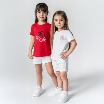 Bright, playful and made for everyday comfort, this red and white pack of two cotton T shirts keeps your lil princess happy through active days. Crafted in soft 180 GSM single jersey cotton, each T shirt features a round neck, half sleeves, regular length and an easy pull on fit that feels gentle on skin. The cheerful cherry prints add cute charm, making these tees perfect for casual outdoors, playtime, picnics and happy moments for girls aged 2 to 10 years.